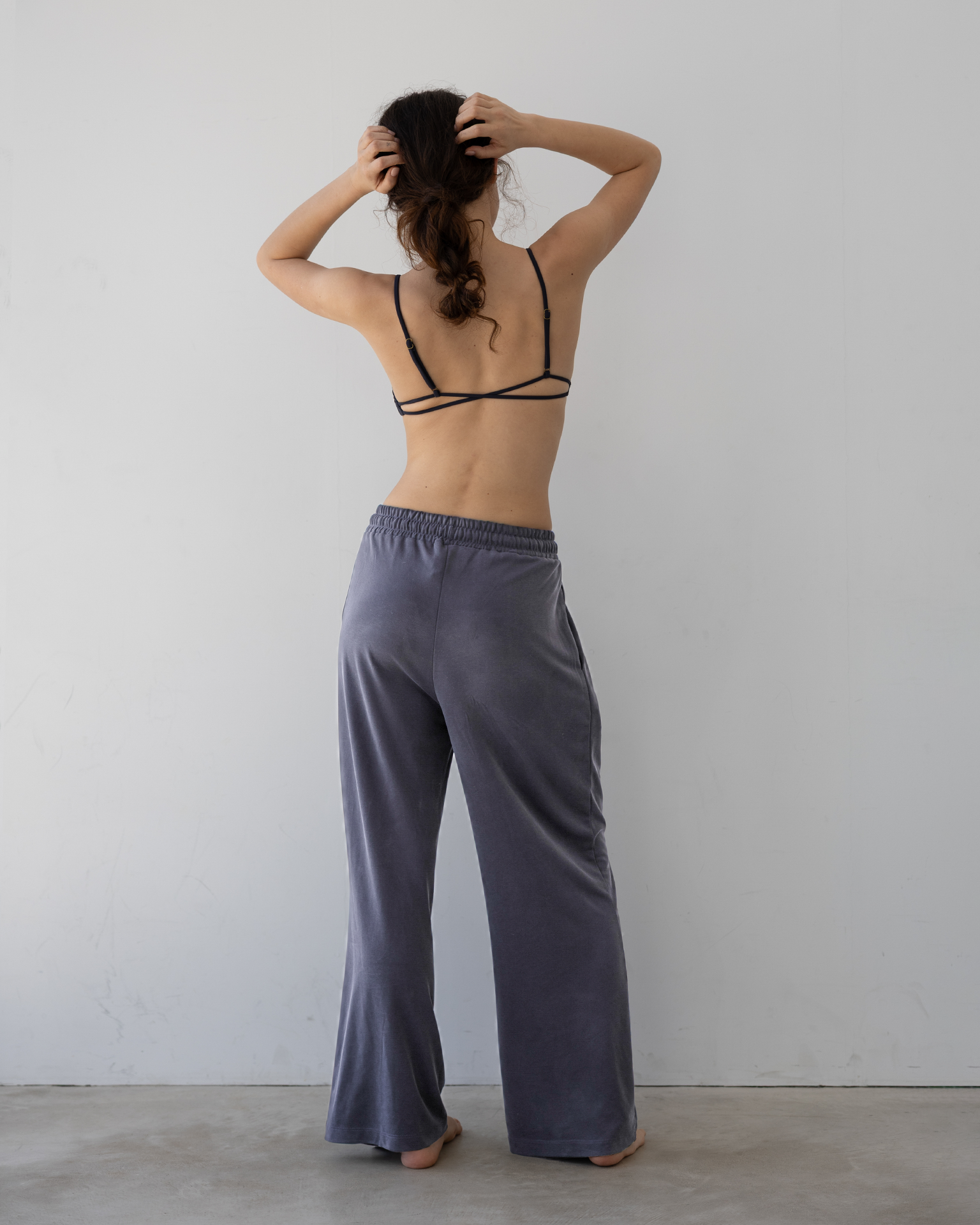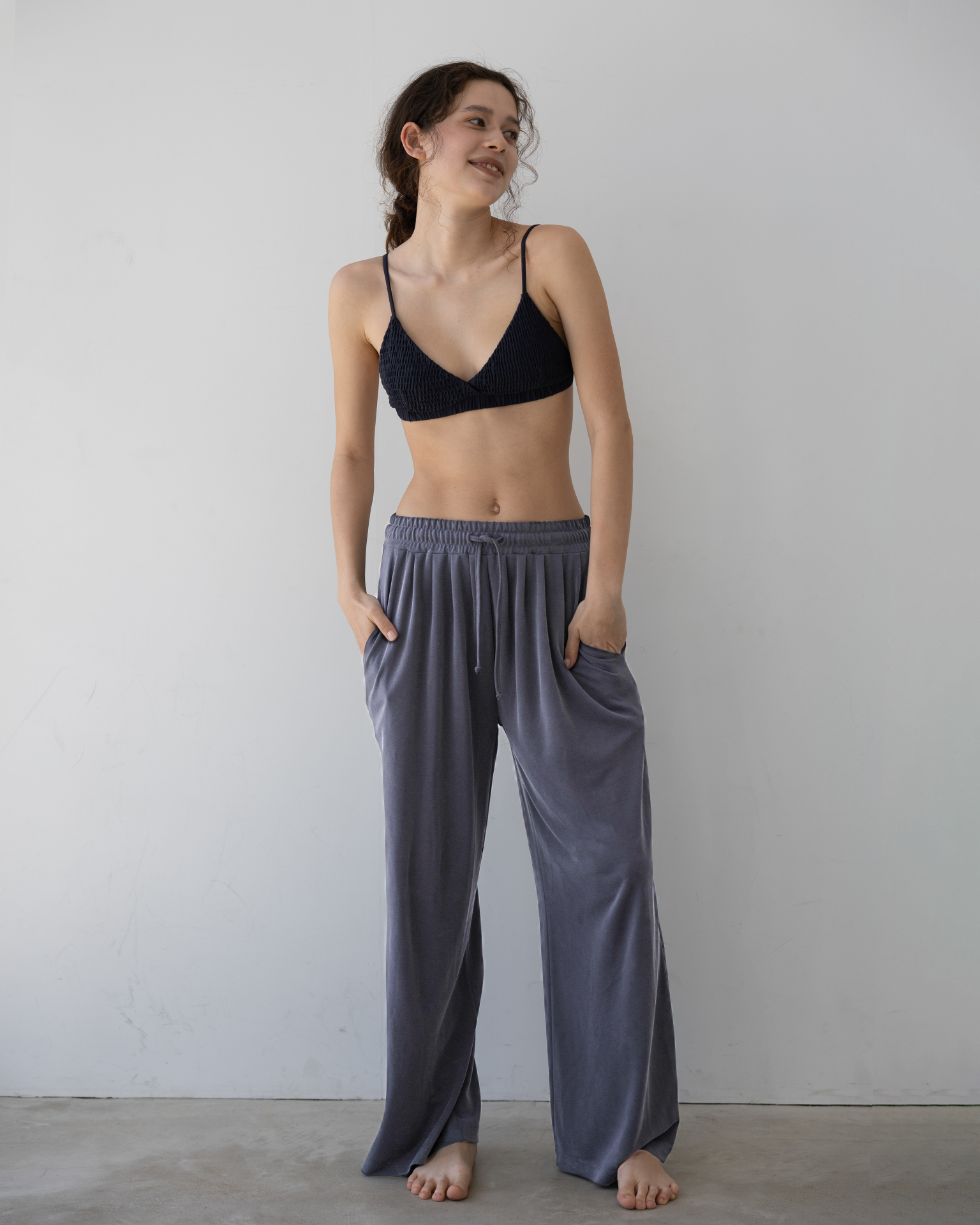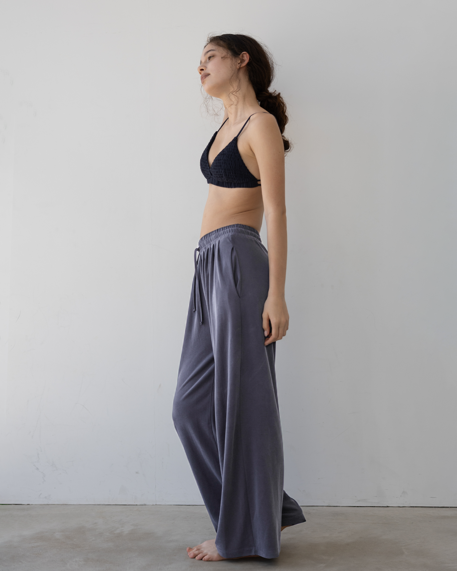 吸湿性や放湿性に優れた肌触りが滑らかなモダール生地を使用したワイドレッグパンツ。