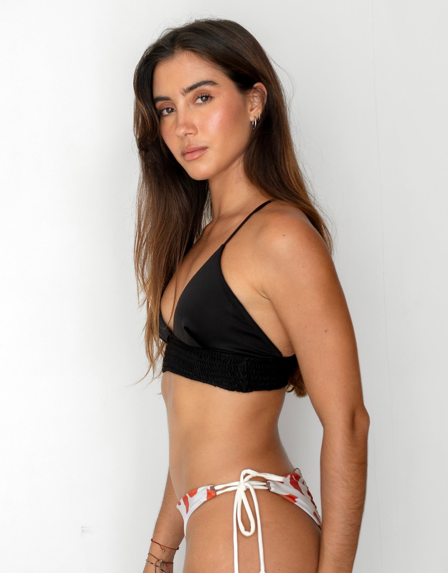 アンダー部分がしっかりとした太めのゴムシャーリングタイプとなっており安定感のあるビキニトップ。