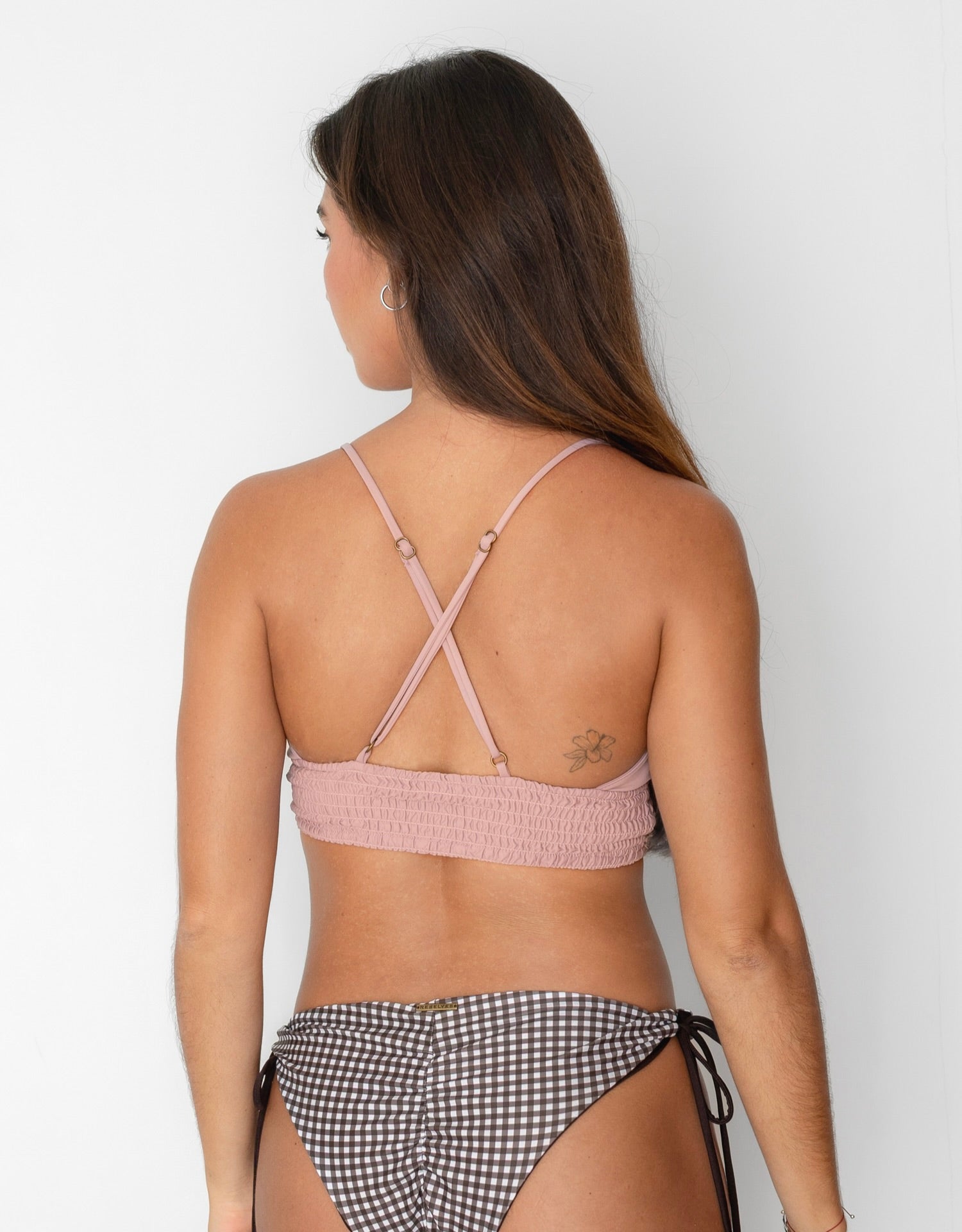 バックのデザインはストラップがクロスになっているので背中をスッキリ魅せてくれます。