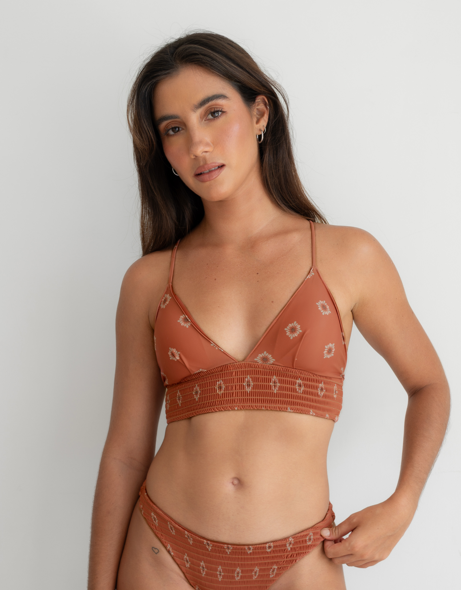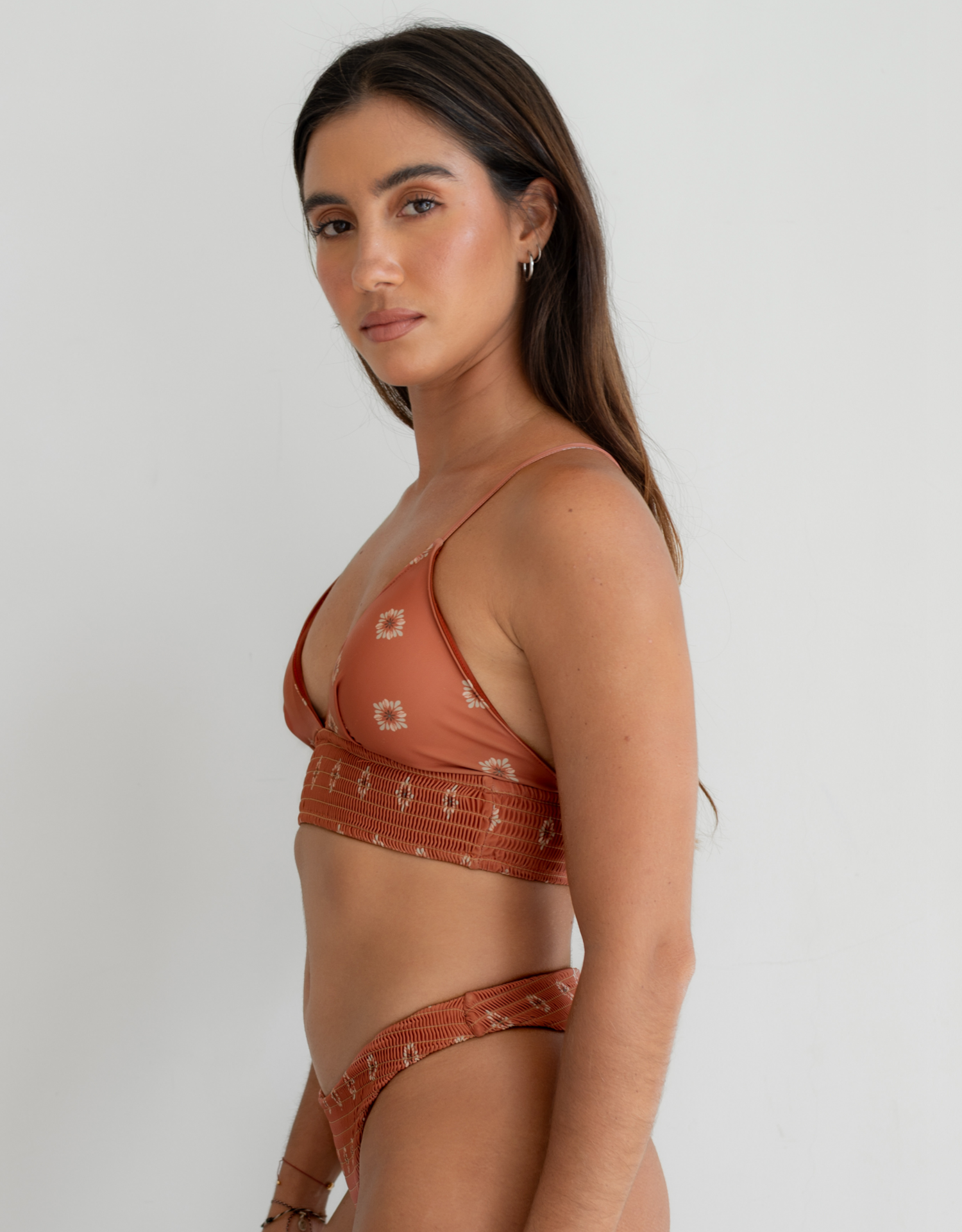 アンダー部分がしっかりとした太めのゴムシャーリングタイプとなっており安定感のあるビキニトップ。