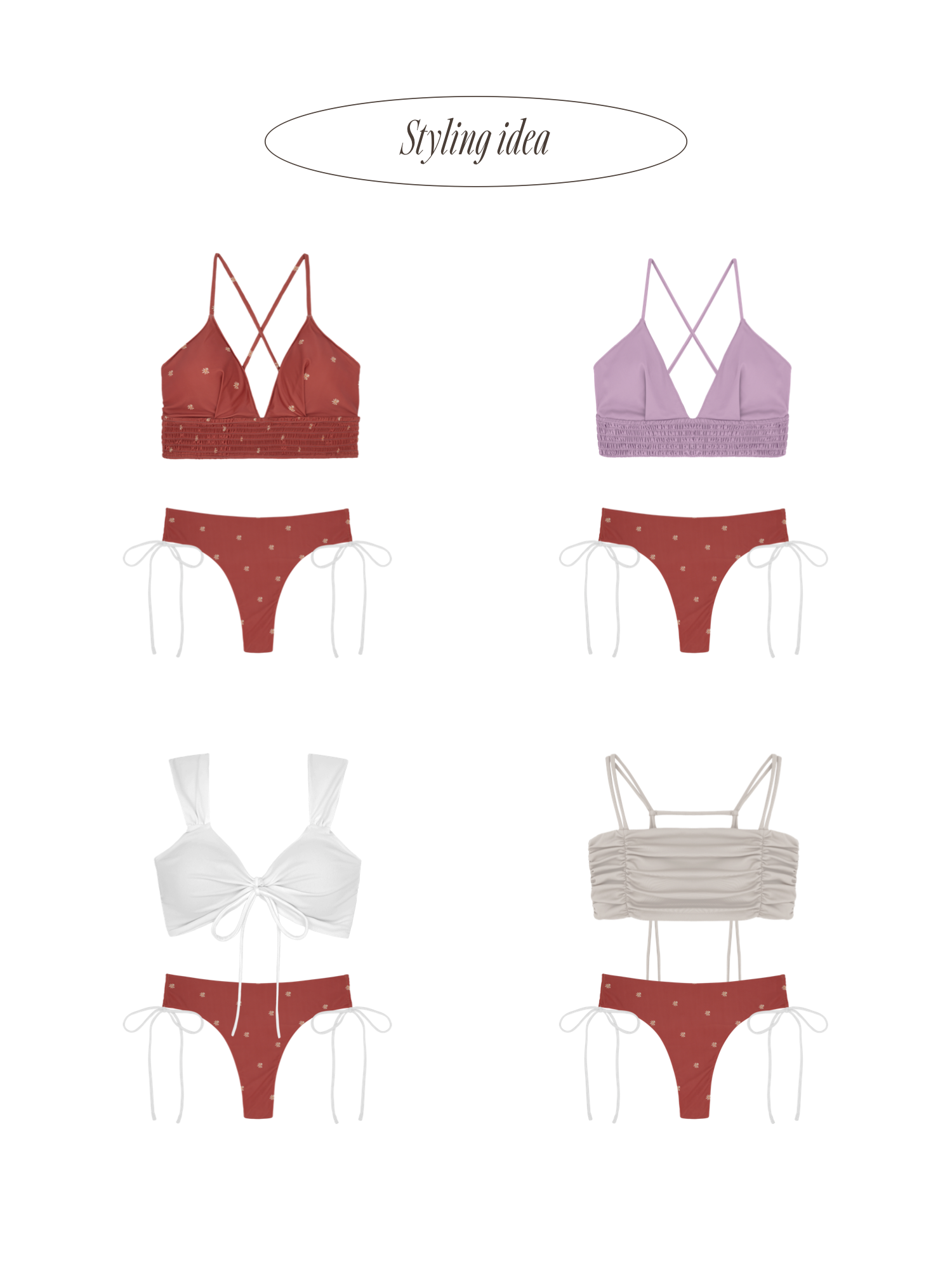 サイドのストラップを絞ることでヒップのカットラインが変わり、露出具合を調節可能。